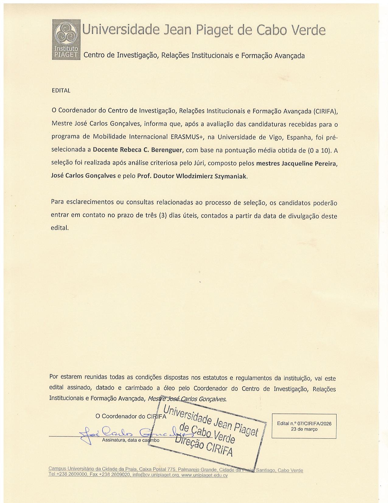 The Coordinator of the Center for Research, Institutional Relations, and Advanced Training (CIRIFA), Mr. José Carlos Gonçalves, informs that, after analyzing and verifying the compliance of applications for the ERASMUS+ mobility program at CIFP Someso, University of Galicia (Spain), the student Wlaldis Gonçalves Varela, a final-year Architecture student, has been pre-selected.