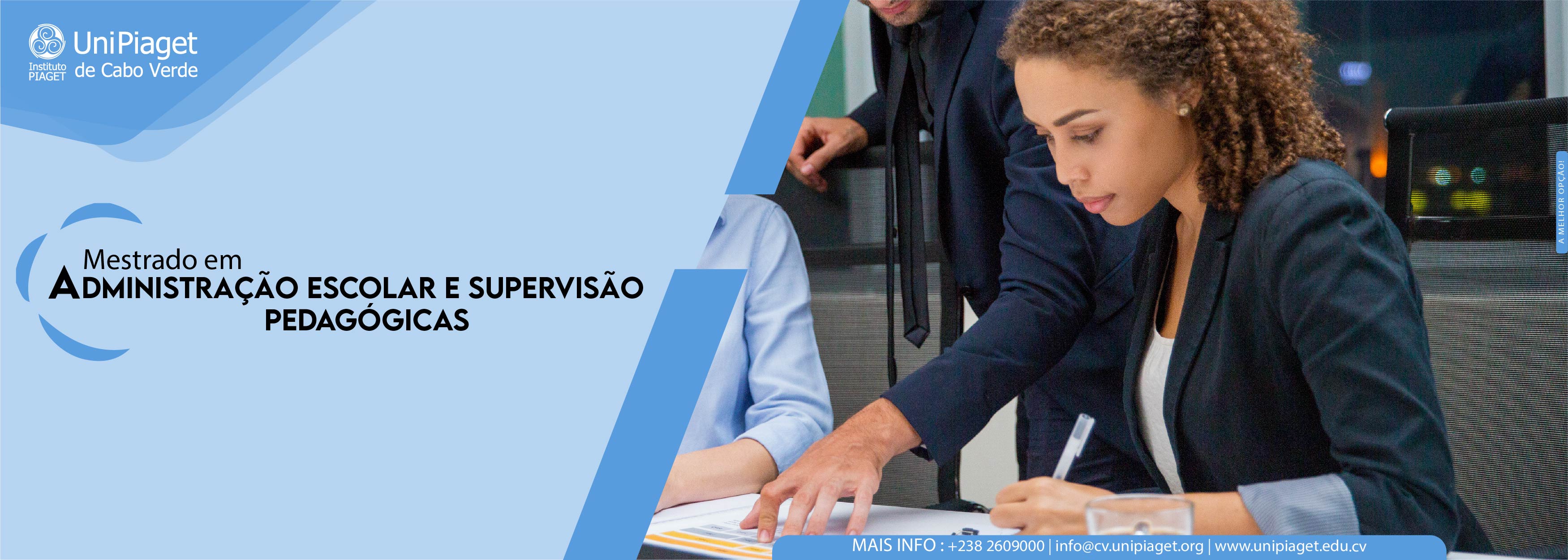 O mestrado em Administração Escolar e Supervisão Pedagógica ofertado pela UniPiaget de Cabo Verde visa promover e reforçar as competências de planeamento, organização, gestão, liderança, avaliação, e comunicação organizacional requeridas a todos aqueles que lidam ou pretendem atuar no campo do desenvolvimento e intervenção na educação, contribuindo para a melhoria dos seus processos e resultados educativos e, consequentemente a elevação da qualidade educativa.
