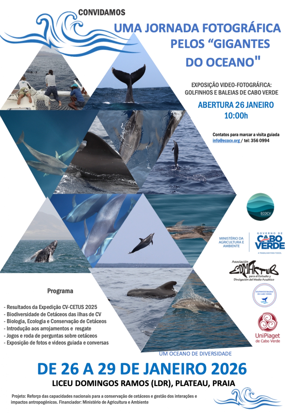 ECOCV em colaboração com a Direção Nacional do Ambiente, Liceu Domingos Ramos , Edmaktub e UniPiaget de Cabo Verde, realizará uma exposição vídeo-fotográfica sobre diversidade, monitorização e conservação de baleias e golfinhos em Cabo Verde.