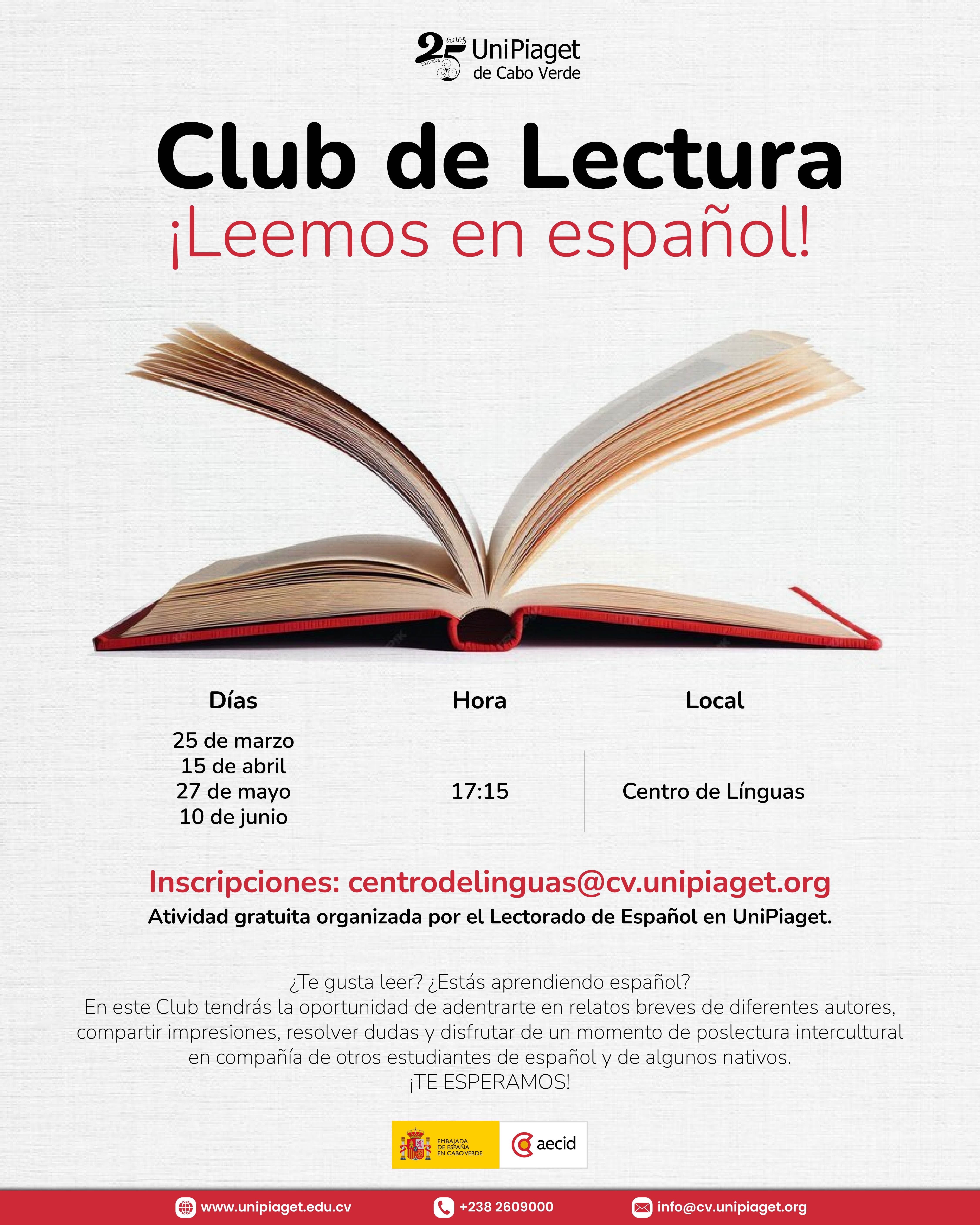 A UniPiaget de Cabo Verde, através do Centro de Línguas, convida a comunidade académica a participar no Club de Lectura, uma atividade gratuita dedicada à leitura e partilha de textos em espanhol.
