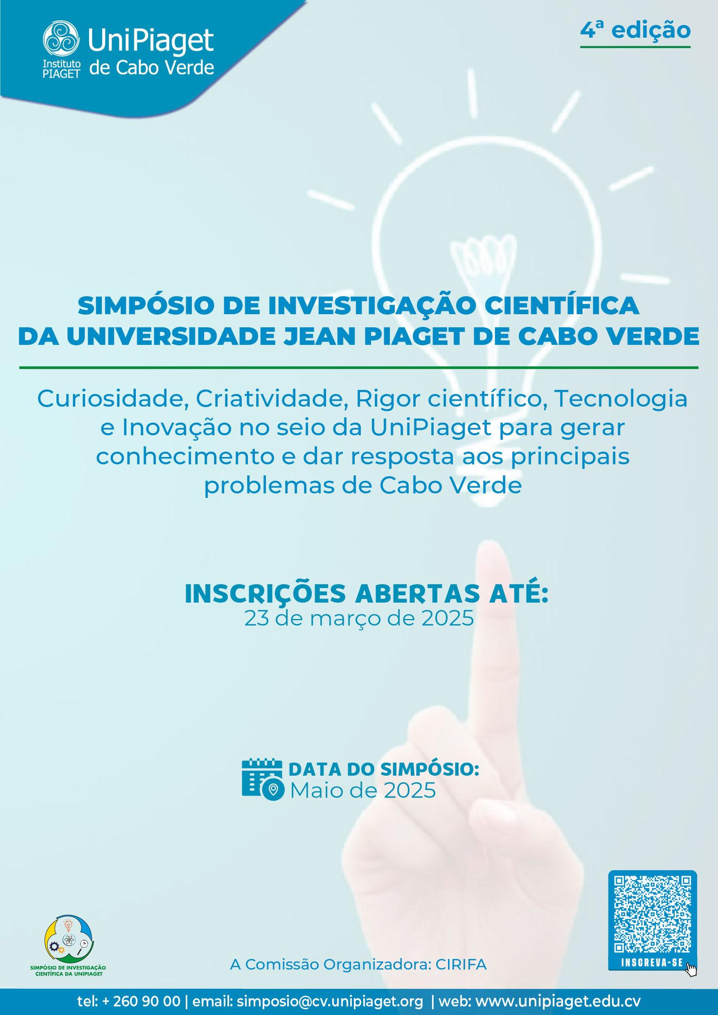 SIGN UP AND PARTICIPATE This year we launched the fourth edition of the Scientific Research Symposium – IV SIC-UniPiaget, a space for sharing knowledge and scientific experiences, open to the entire UniPiaget university community but also researchers and collaborators from the diaspora, from inside and outside Cape Verde. One of the pillars of the university is research, which brings scientific knowledge, capable of generating innovative solutions to society's problems. But for resear...