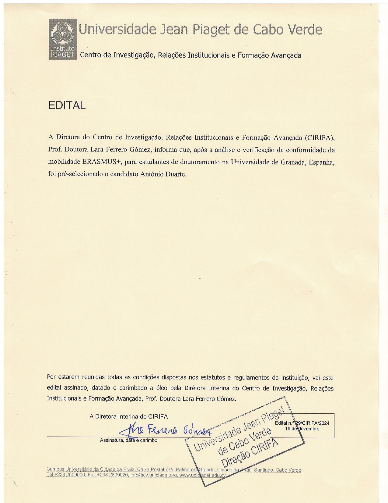 The Director of the Center for Research, Institutional Relations, and Advanced Training (CIRIFA), Professor Doctor Lara Ferrero Gómez, informs that after the analysis and verification of compliance under the ERASMUS+ mobility program for doctoral students at the University of Granada, Spain, the candidate António Duarte has been pre-selected.