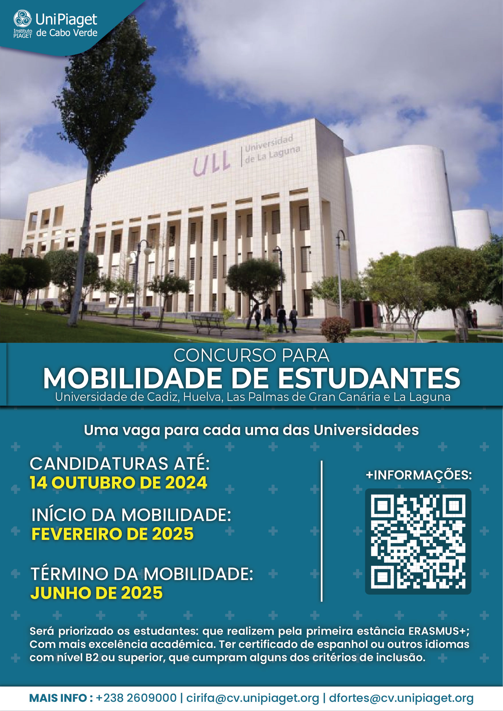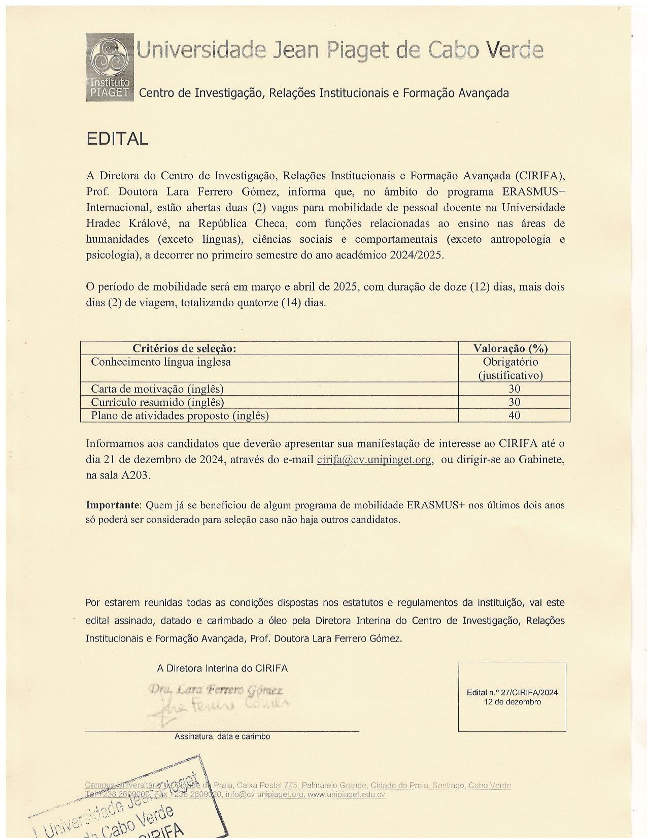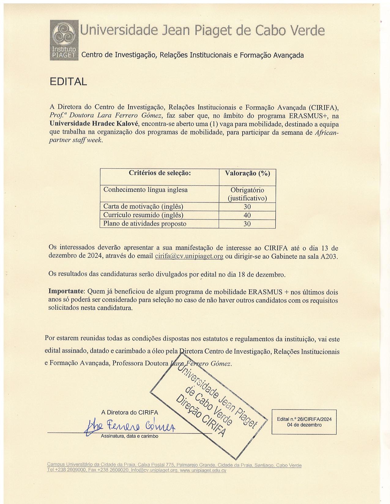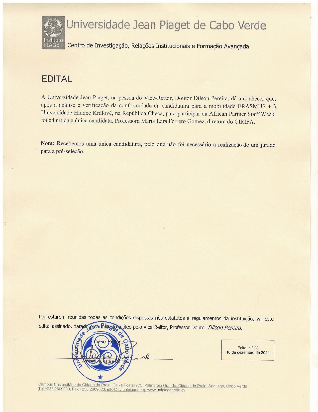 Jean Piaget University, represented by the Vice-Rector, Dr. Dilson Pereira, announces that after the analysis and verification of the compliance of the application for ERASMUS+ mobility to the University of Hradec Králové, in the Czech Republic, for participation in the African Partner Staff Week, the sole candidate, Professor Maria Lara Ferrero Gomez, Director of CIRIFA, has been admitted.