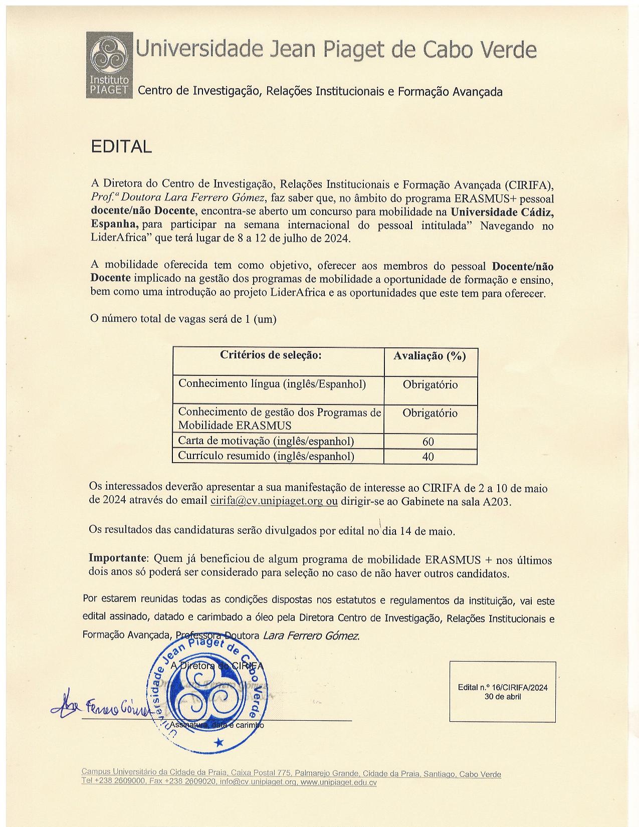 The Director of the Center for Research, Institutional Relations and Advanced Training (CIRIFA), Professor Lara Ferrero Gómez, announces that a competition for mobility is open at the University of Cádiz, Spain, within the scope of the ERASMUS+ program for teaching/non-teaching staff .This mobility is intended for participation in the international staff week, entitled “Navigating LiderAfrica”, which will take place from 8 to 12 July 2024. The purpose of this mobili...