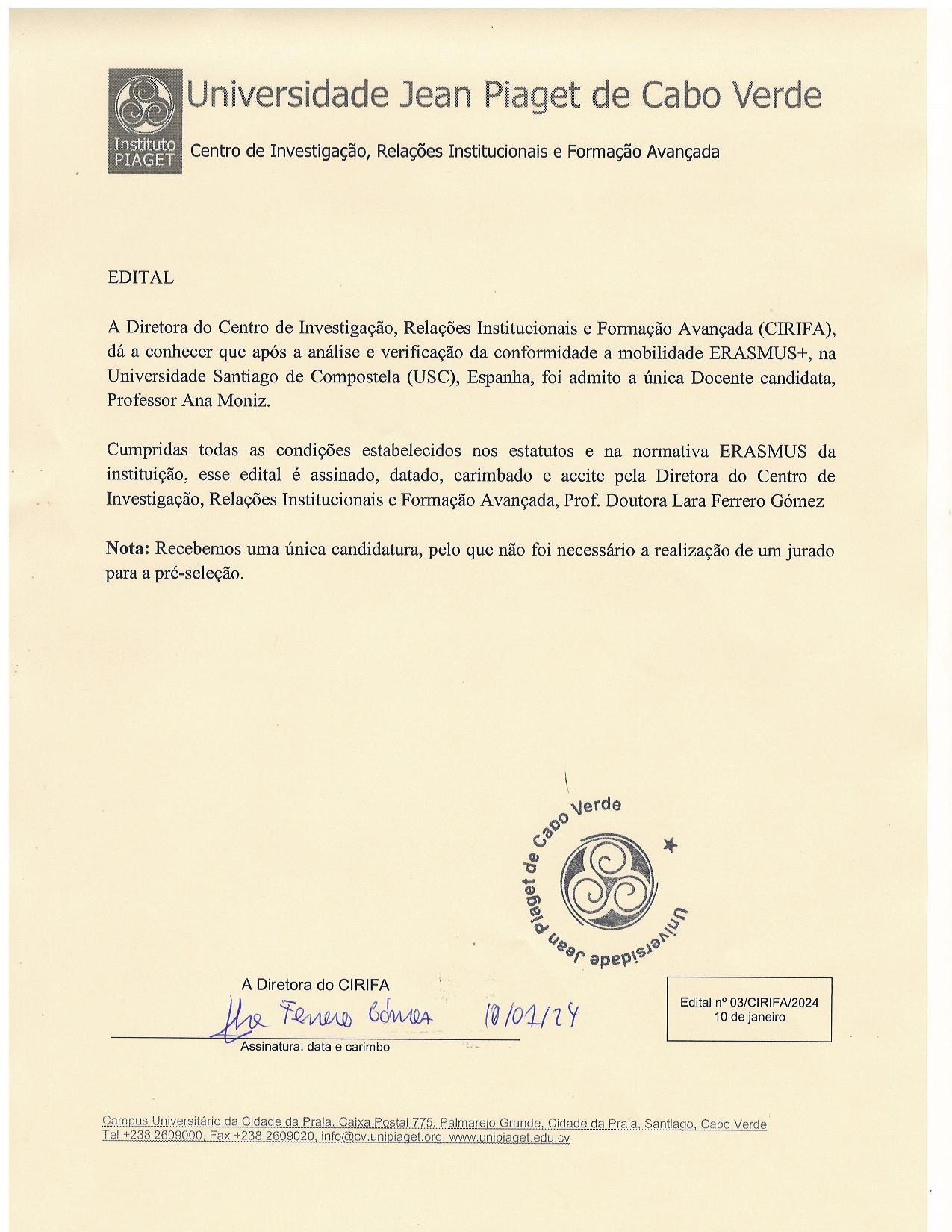 O Centro de Investigação, Relações Institucionais e Formação Avançada (CIRIFA) anuncia que a Professora Ana Moniz foi aceite como participante no programa ERASMUS+ da Universidade de Santiago de Compostela, na Espanha.Após minuciosa análise e verificação das exigências de conformidade e mobilidade estipuladas pelo programa ERASMUS, a candidatura da Professora Ana Moniz foi aprovada. Todas as condi&cce...
