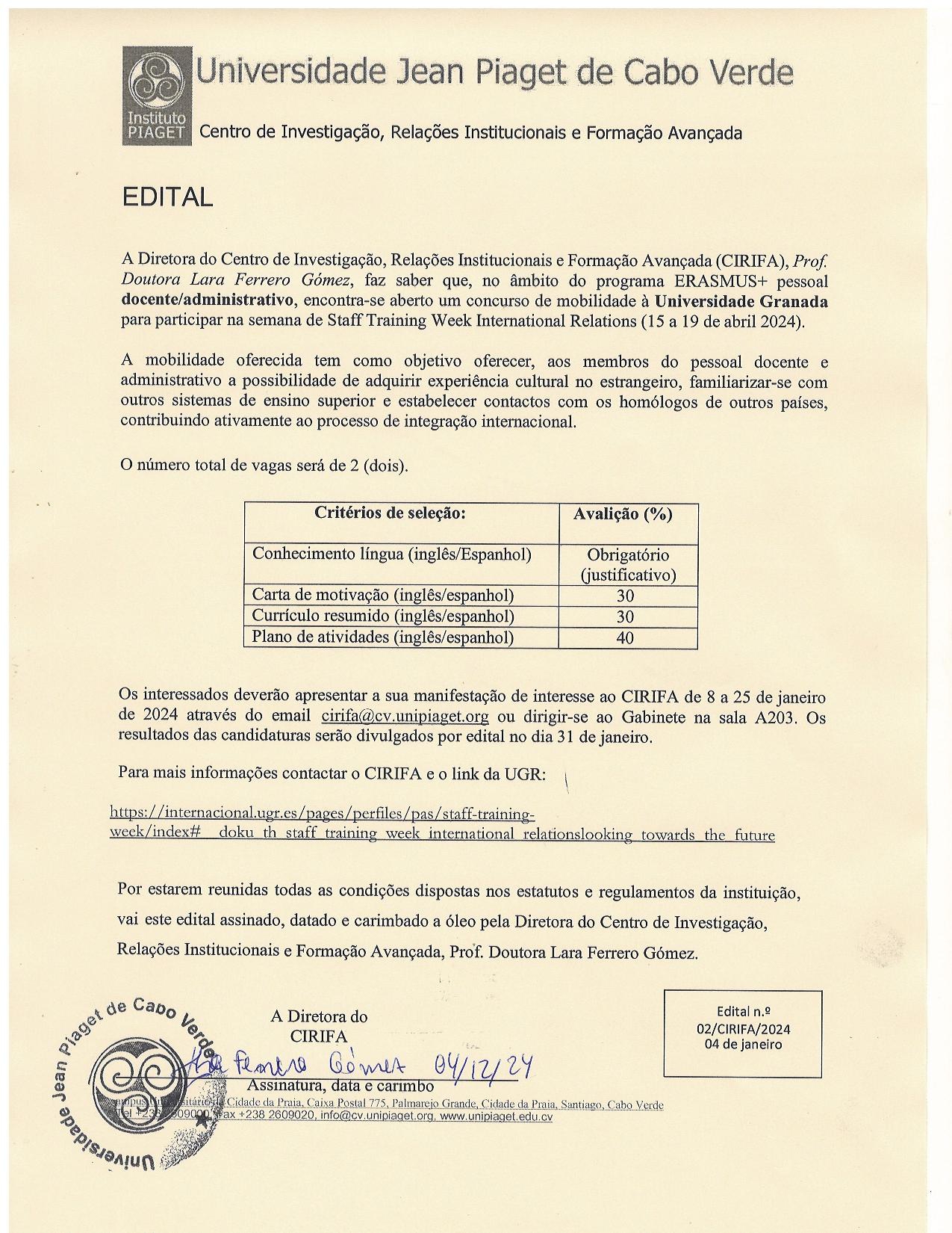 O Centro de Investigação, Relações Institucionais e Formação Avançada (CIRIFA) da UniPiaget faz saber que, no âmbito do programa ERASMUS+ Internacional, encontra se aberto uma (1) vaga para mobilidade de pessoal docente para a Universidade de Málaga, Espanha.O período de mobilidade será em março de 2024 com uma duração total de 12 dias entre viagens e docência em várias...