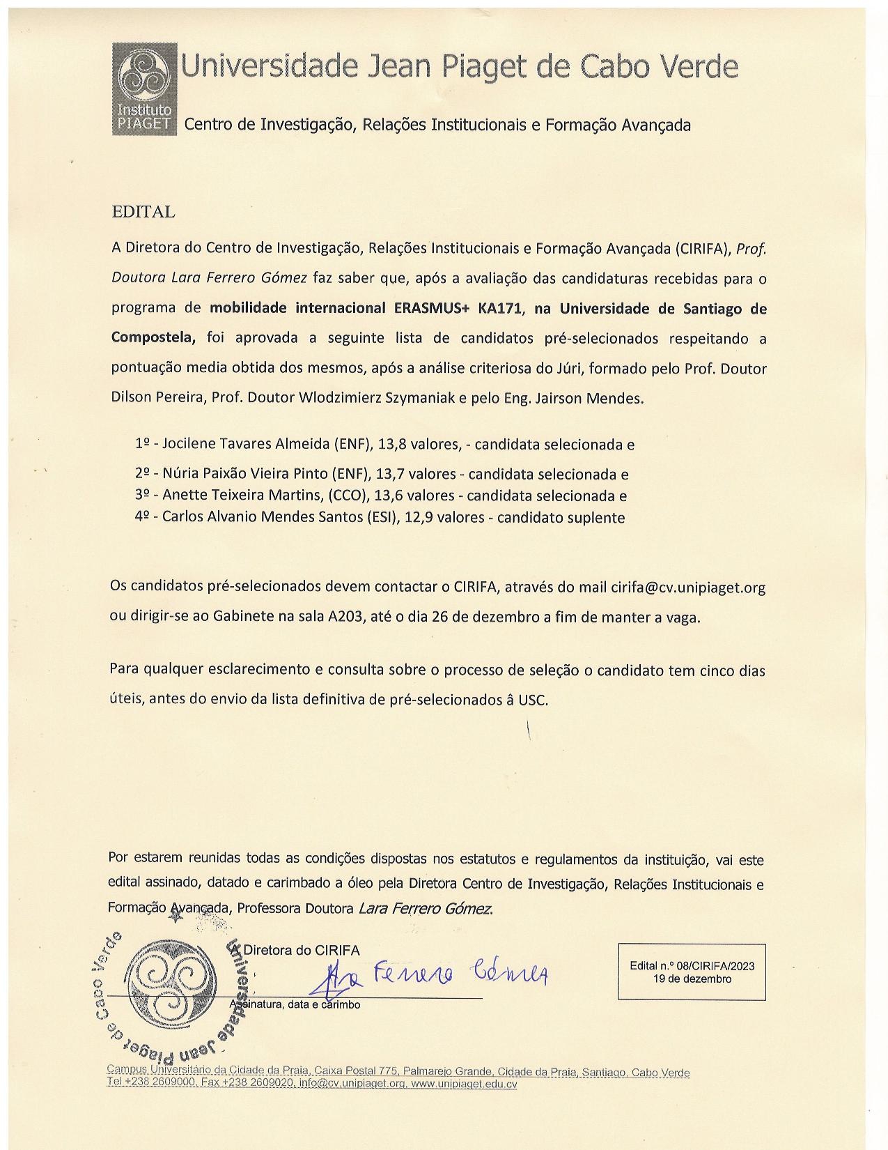 O Centro de Investigação, Relações Institucionais e Formação Avançada (CIRIFA) faz saber a toda a comunidade académica e aos interessados em geral o resultado do concurso recentemente lançado para mobilidade académica na Universidade de Santiago de Compostela em Espanha.Após a avaliação da média dos alunos que concorreram para o intercâmbio, tivemos uma prévia deliberaçã...