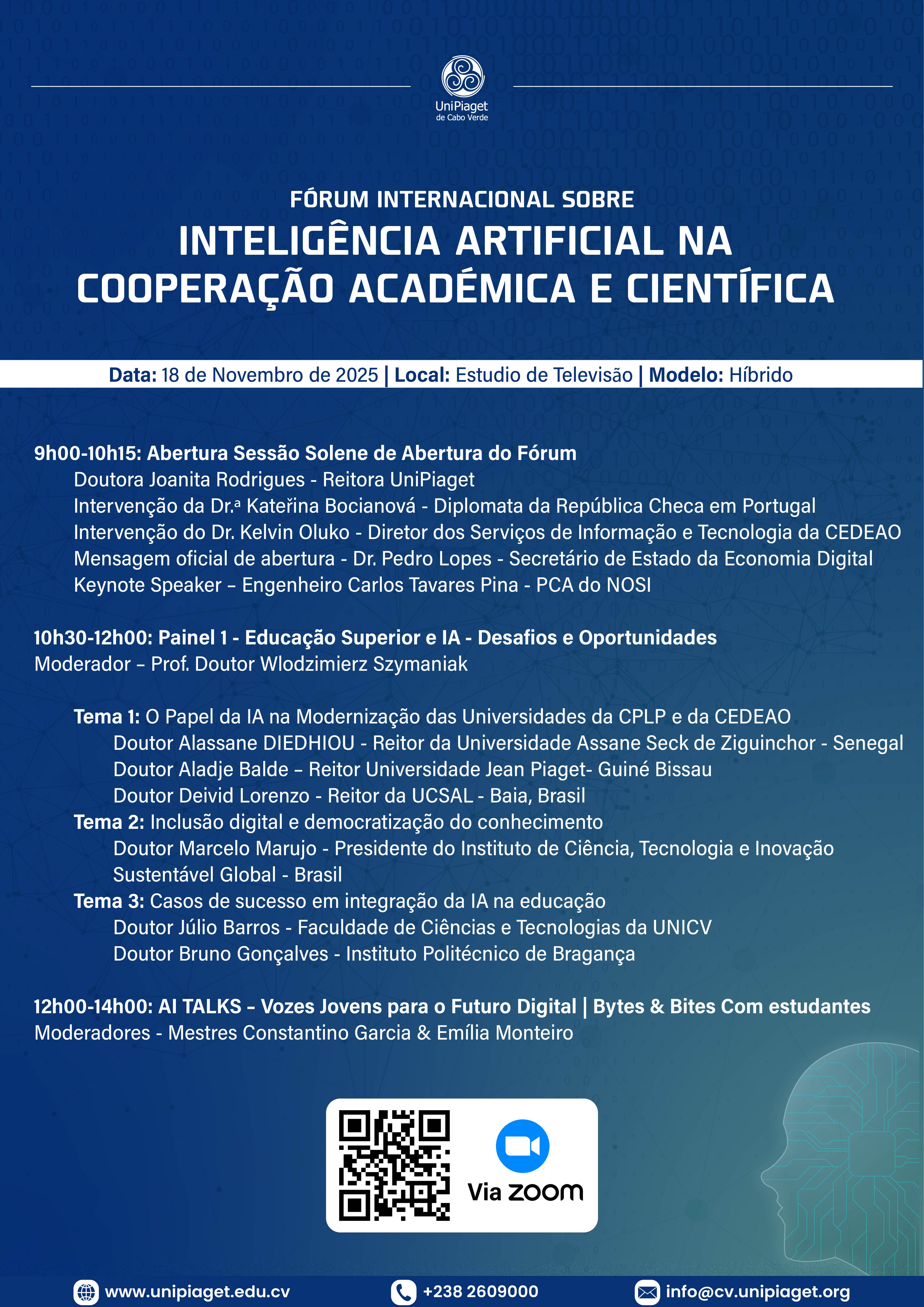 A Universidade Jean Piaget de Cabo Verde promove, no dia 18 de novembro de 2025, o Fórum Internacional sobre Inteligência Artificial na Cooperação Académica e Científica, sob o tema “O papel da Inteligência Artificial no Ensino e na Investigação no espaço da CPLP e CEDEAO”.