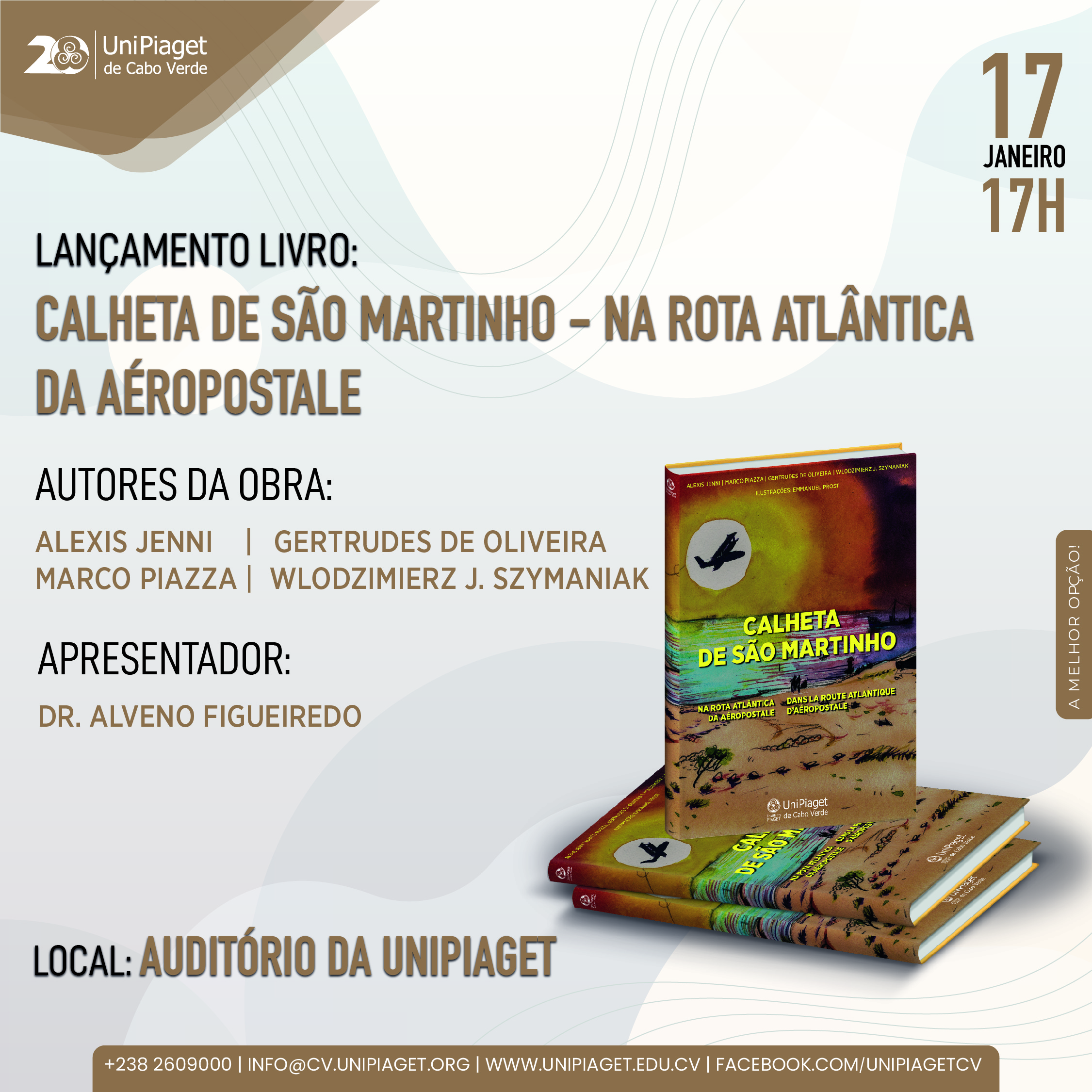 A UniPiaget de Cabo Verde acolhe no dia 17 de janeiro de 2022, pelas 17h, no auditório “Almeida Santos” o lançamento do livro “Calheta de São Martinho na Rota Atlântica da Aéropostale” da autoria de Alexis Jenni, Marco Piazza, Gertrudes de Oliveira e Wlodzimierz Josef Szymaniak.