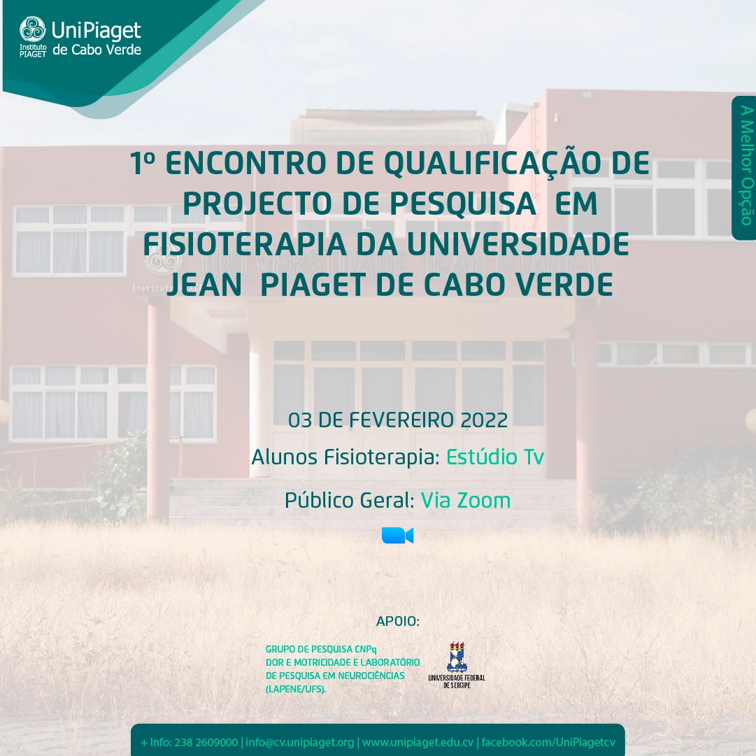 O estúdio de TV da UniPiaget, acolherá no dia 3 de fevereiro de 2022, das 09h às 15h, em formato on-line, o 1º Seminário de qualificação de projeto de pesquisa em fisioterapia da Universidade Jean Piaget de Cabo Verde, desenvolvido no âmbito da disciplina de Projeto de Pesquisa em Fisioterapia.