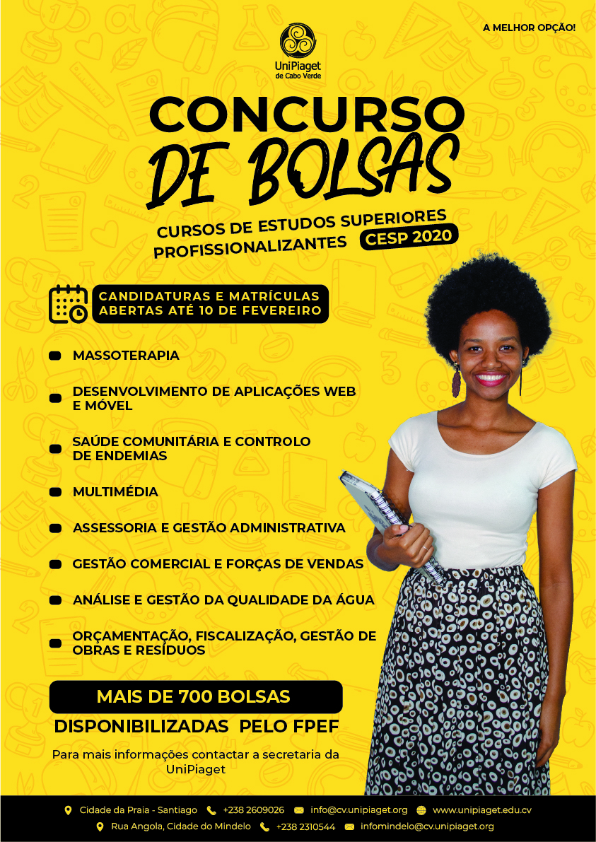 A UniPiaget, em parceria com Fundo de Promoção do Emprego e da Formação – FPEF tem aberto, para o presente ano lectivo, mais de 700 bolsas de estudo, todas elas destinadas a Curso de Estudos Superiores Profissionalizantes (CESP).