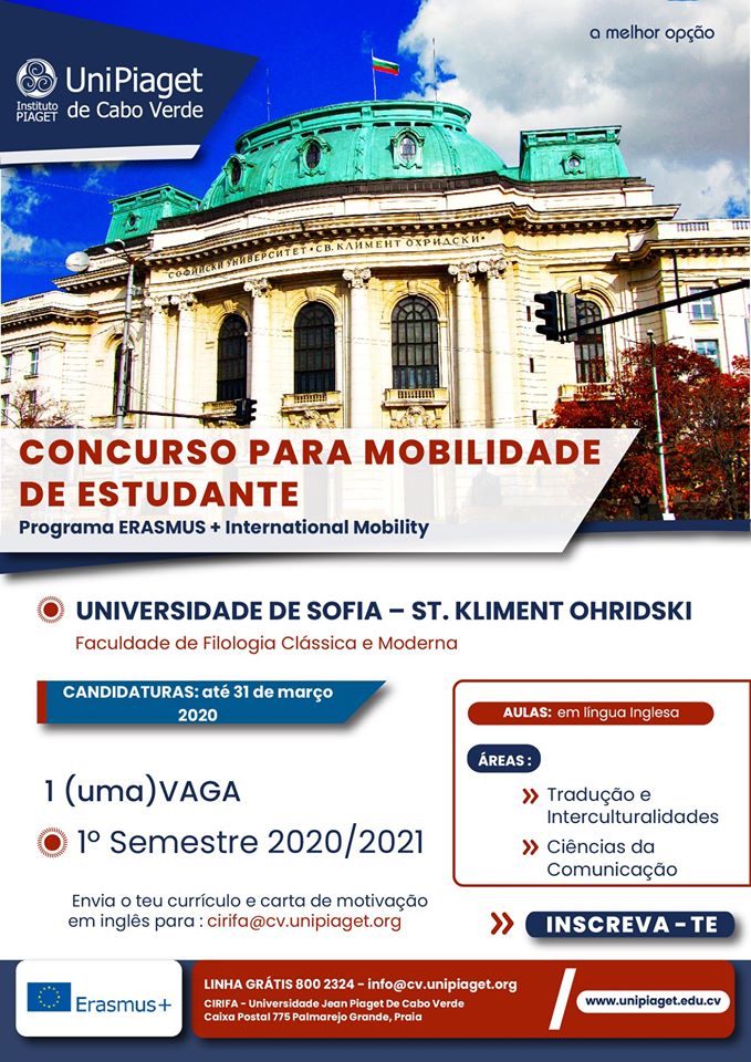 Os estudantes do curso de “Ciências da Comunicação” e de “Tradução e Interculturalidades” da Universidade Jean Piaget de Cabo Verde têm, no ano lectivo 2019/2020, mais uma oportunidade de realizar parte do seu percurso universitário na Universidade de Sófia, Bulgária – Faculdade de Filologia Clássica e Moderna.