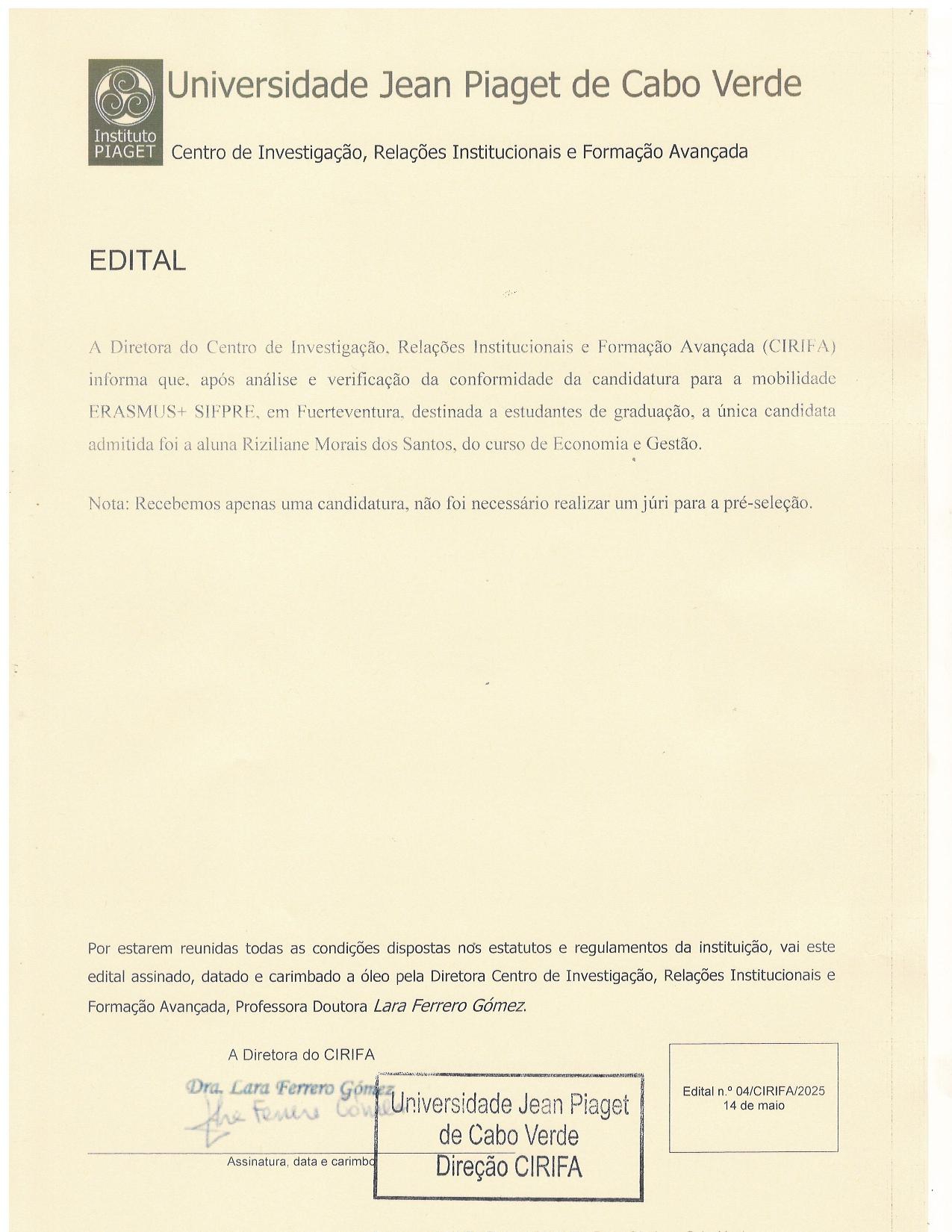 A Diretora do Centro de Investigação, Relações Institucionais e Formação Avançada (CIRIFA) informa que, após análise e verificação da conformidade das candidaturas para a mobilidade ERASMUS+ SIFPRE, em Fuerteventura, destinada a estudantes de graduação, a única candidata admitida foi a aluna Rizilaine Morais dos Santos, do curso de Economia e Gestão.