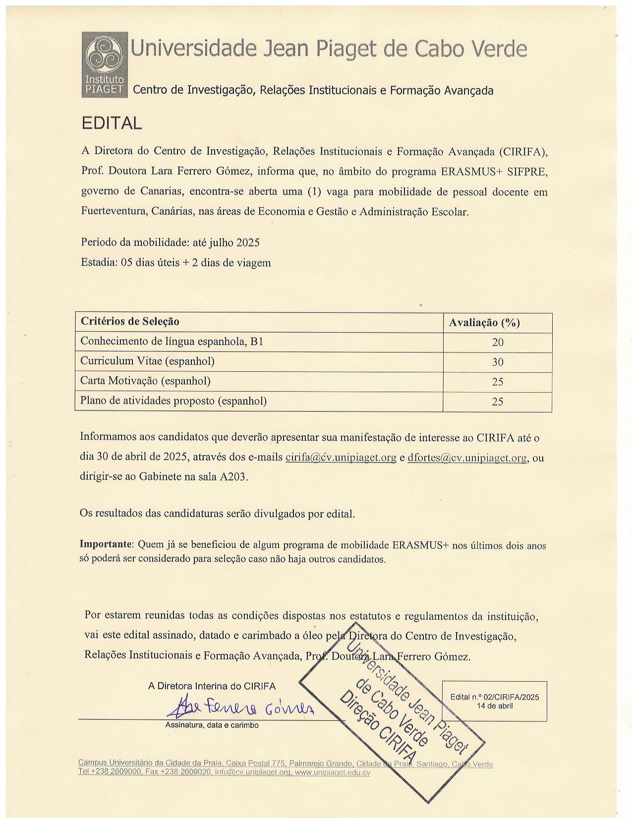 The Center for Research, Institutional Relations, and Advanced Training (CIRIFA) at Jean Piaget University of Cape Verde announces the opening of one position for staff mobility under the ERASMUS+ SIFPRE program. This opportunity is aimed at the fields of Economics and Management and School Administration, with the destination being Fuerteventura, Canary Islands.