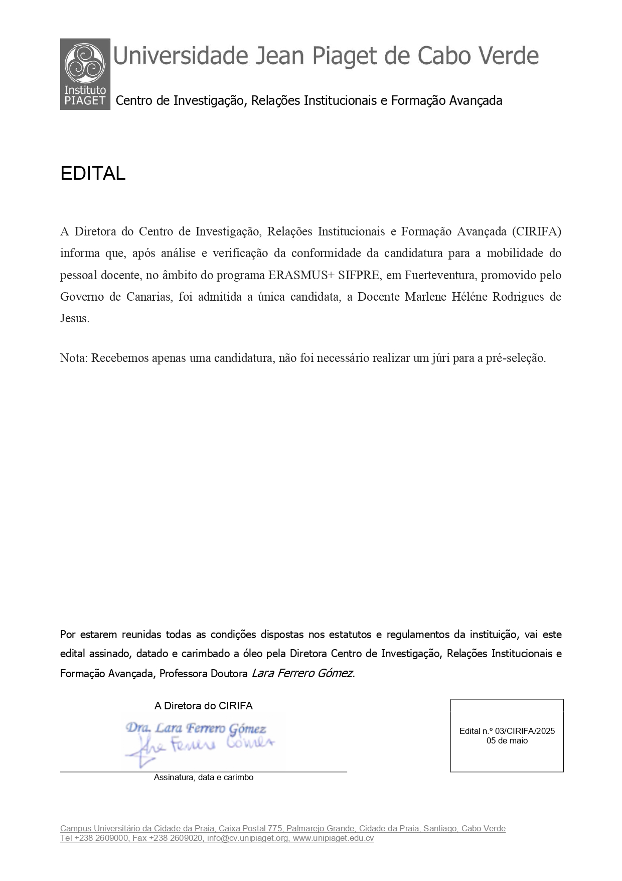 A Diretora do Centro de Investigação, Relações Institucionais e Formação Avançada (CIRIFA) informa que, após análise e verificação da conformidade da candidatura para a mobilidade do pessoal docente, no âmbito do programa ERASMUS+ SIFPRE, em Fuerteventura, promovido pelo Governo de Canárias, foi admitida a única candidata, a Docente Marlene Hélène Rodrigues de Jesus.