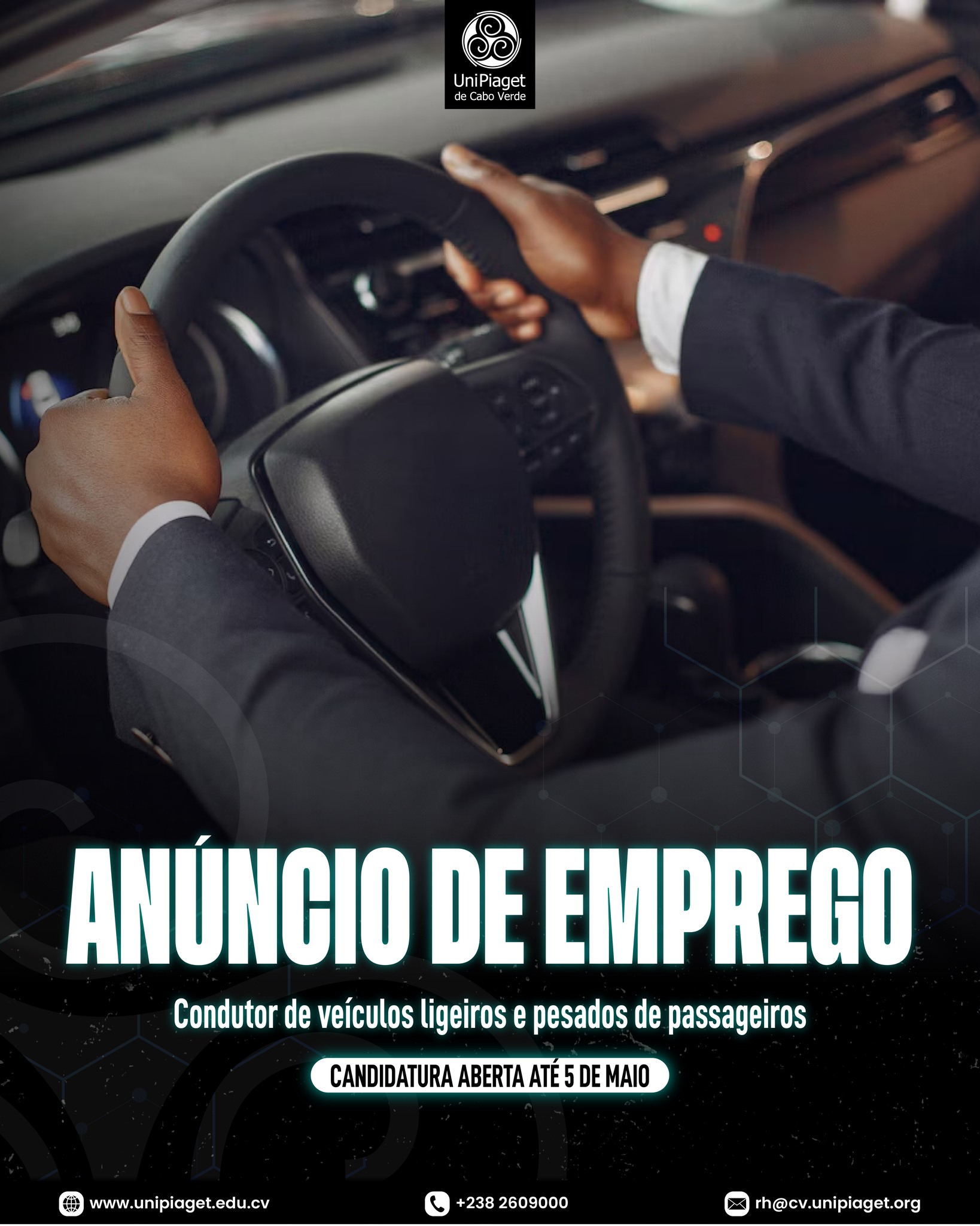 A UNIVERSIDADE JEAN PIAGET DE CABO VERDE informa que se encontra aberto o concurso para a contratação de um condutor de veículos ligeiros e pesados de passageiros, para o Campus da cidade da Praia.