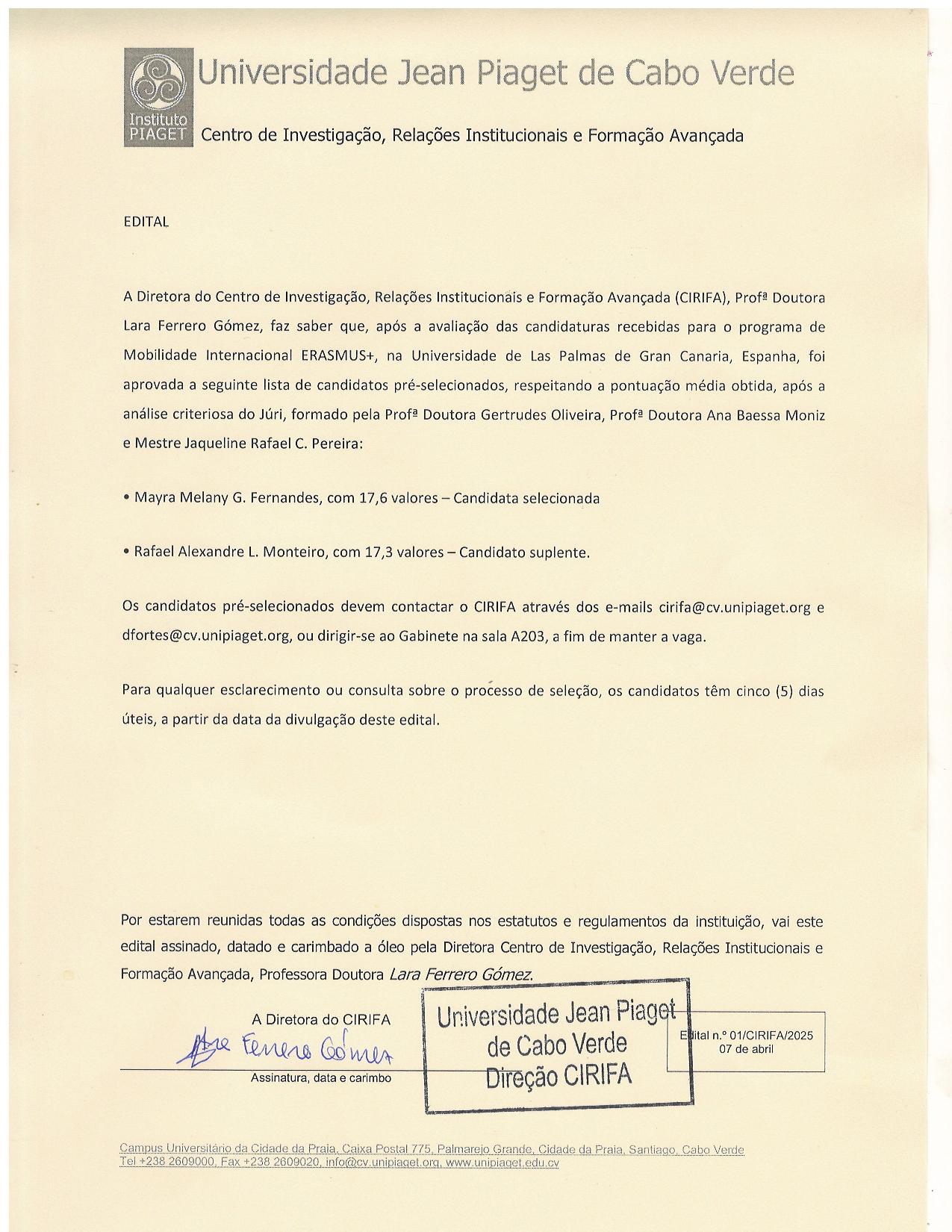 The Director of the Center for Research, Institutional Relations, and Advanced Training (CIRIFA), Prof. Dr. Lara Ferrero Gómez, announces that, following the evaluation of applications submitted for the ERASMUS+ International Mobility Program at the University of Las Palmas de Gran Canaria, Spain, the following list of pre-selected candidates has been approved, based on the average scores obtained and a thorough analysis by the jury, composed of Prof. Dr. Gertrudes Oliveira, Prof. Dr. ...