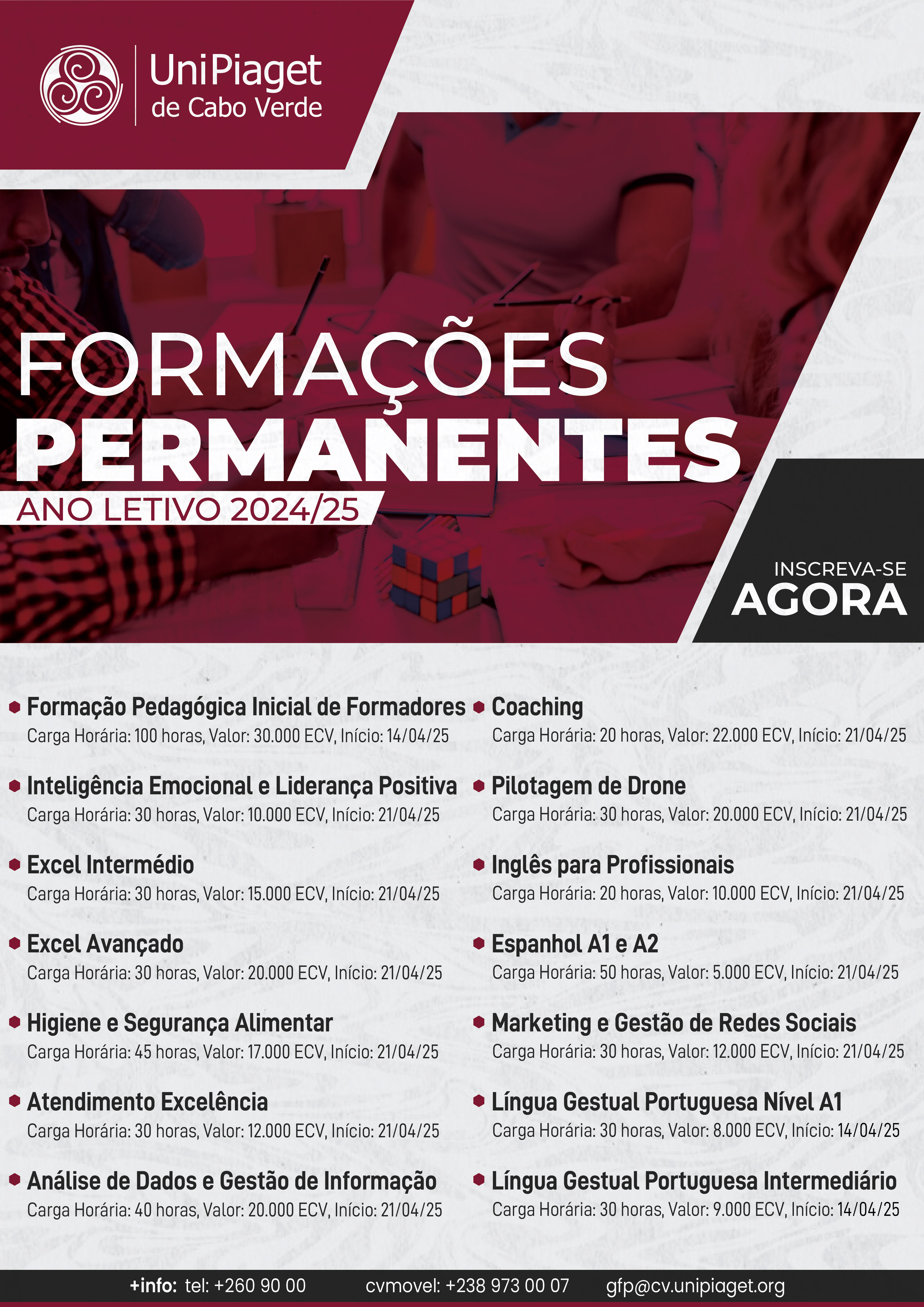 UniPiaget of Cape Verde proudly presents its Permanent Training programme for the academic year 2024/25, offering a unique opportunity to acquire new skills and update knowledge in areas of great relevance in today’s job market.